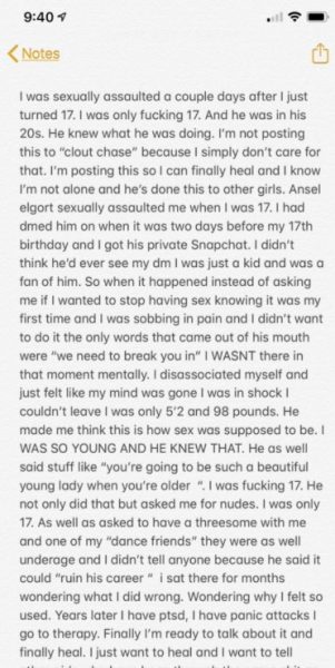 “Elgort mi ha stuprata quando avevo 17 anni….ero solo una bambina ed ero sua fan. Quando lo abbiamo fatto invece di chiedermi se volessi smettere di fare sesso, sapendo che era la mia prima volta, e che stavo gemendo di dolore e non volevo farlo, le uniche parole che sono uscite dalla sua bocca sono state: “dobbiamo andare oltre”. In quel momento non ero presente mentalmente, mi ero dissociata da me stessa e la mia mentre era lontano. Ero sotto shock non sono riuscita ad andarmene, pesavo solo 48 chili”.
