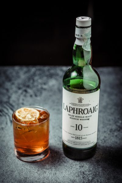 In un bicchiere Old Fashioned sciogliere la zolletta di zucchero con un pizzico di sale e lo sherry, aggiungere ghiaccio e versare whisky Laphroaig.
